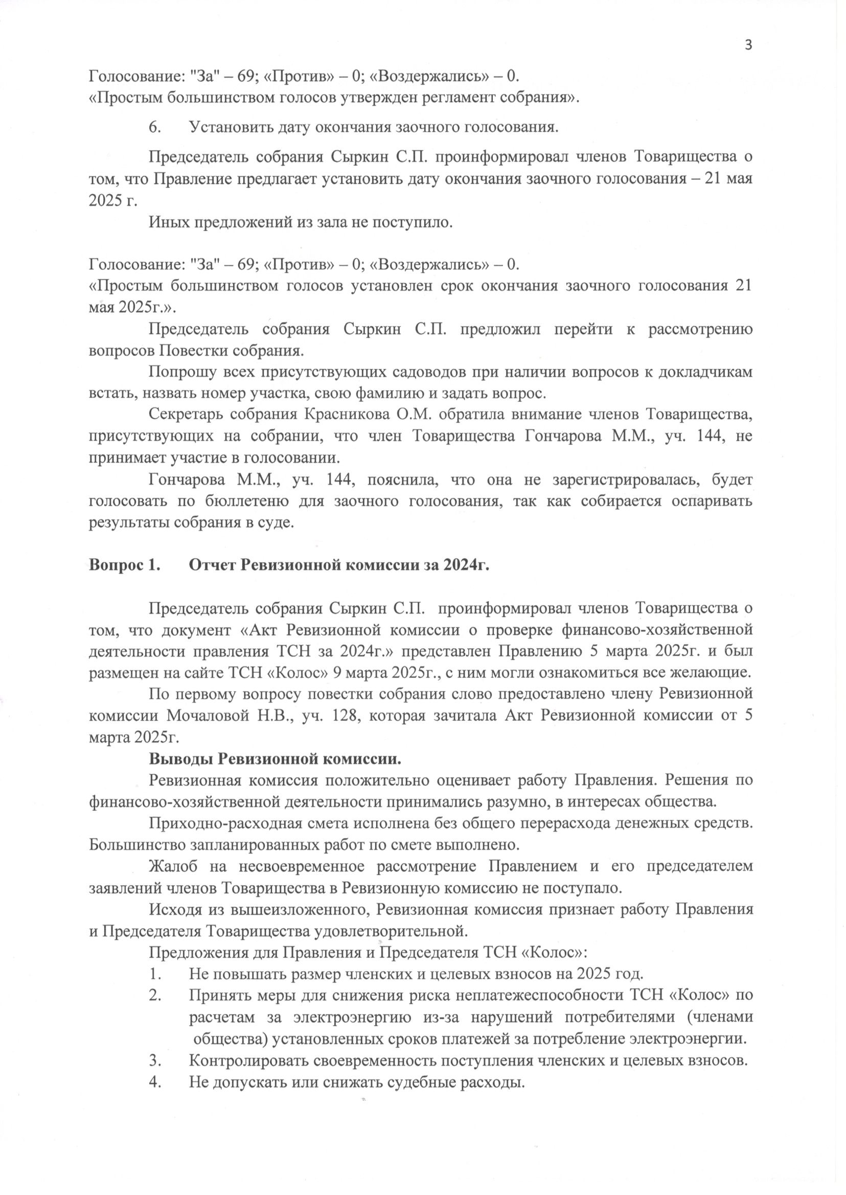 ПРОТОКОЛ итоговый по очной и заочной частям общего очередного отчетного собрания членов товарищества собственников недвижимости «КОЛОС»